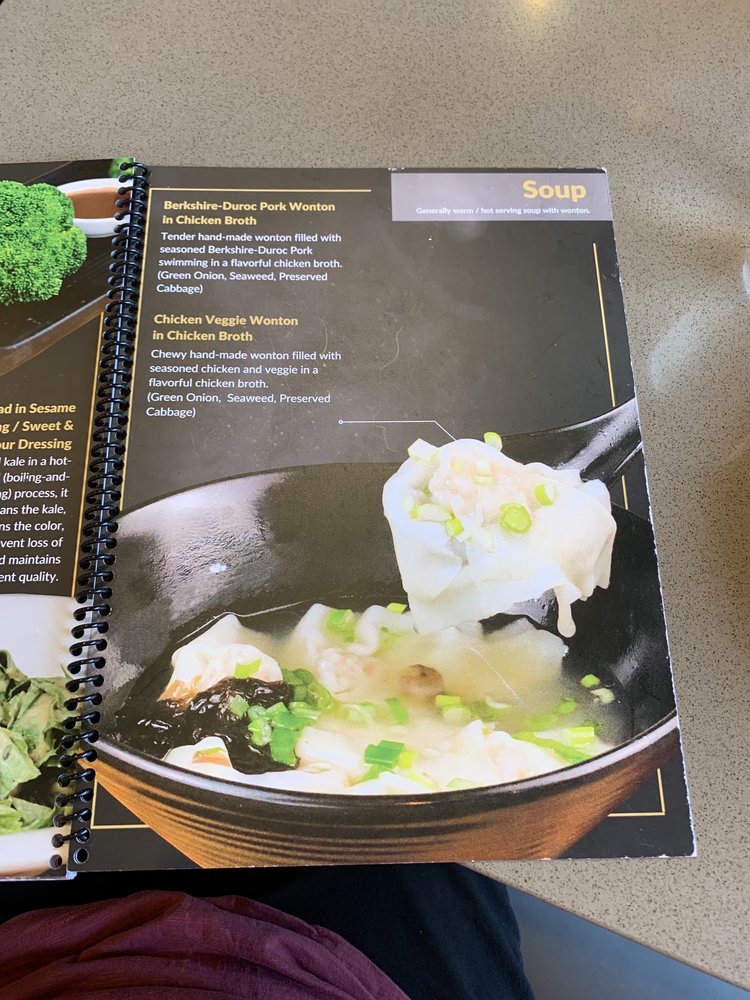 Tender hand-made wontons filled with seasoned Berkshire-Duroc Pork swimming in a flavorful chicken broth.